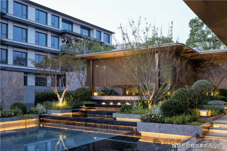 中央水景联动地面景观及地下会所空间,通过三层叠水形成了特色鲜明的水景庭院,引领未来社区发展新趋势。