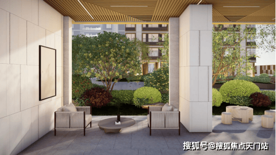 第二进——珠翠回廊:以水面景观为主体,利用富有度假感的河桦与静水面打造极具特色的前场景观,廊中水景上树阵的设计,营造出了丰富的景观空间、增添归家仪式感。