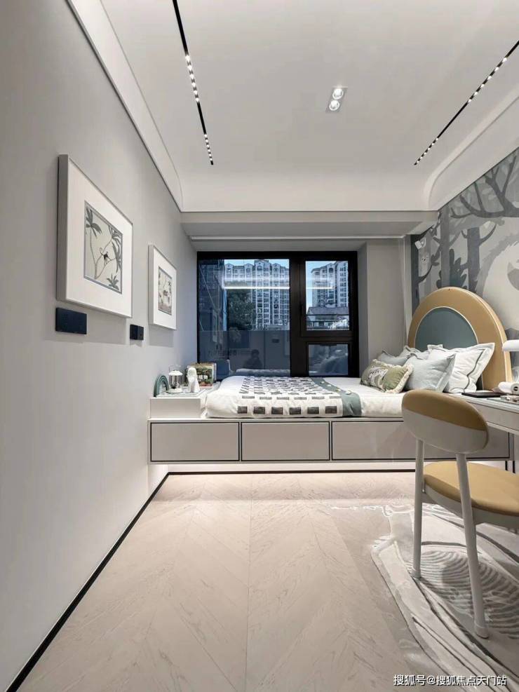 其中主卧的270°转角飘窗就有约5.7m²,通过与外立面的结合,直接做了梳妆台和储物柜,拓展了飘窗的实用性。
