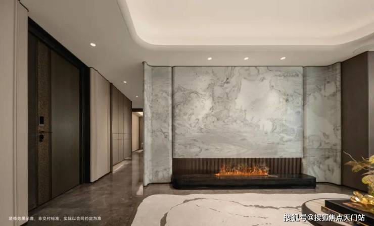 客厅背景墙的“烟雨江南”天然大理石,不同于传统平面背景墙,通过弧度及立体的造型处理,并镶嵌不锈钢材质,对于金茂而言,比奢石昂贵的,是让奢石真正与空间气场融为一体。