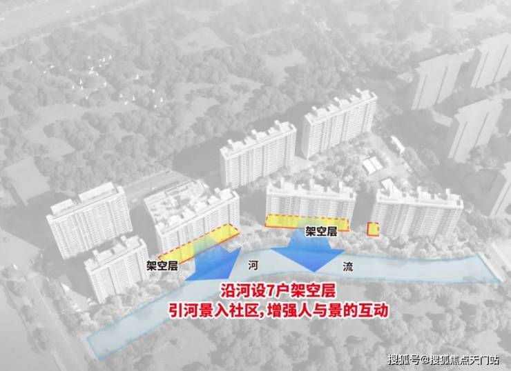 项目南向临河,为了更好发挥水岸优势, 沿河设7户架空层,把河景最大程度引入社区。