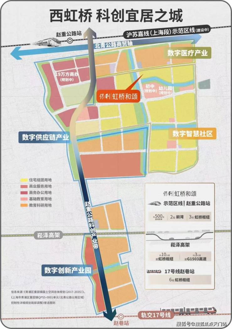 保利虹桥和颂位于青浦新城现代新型人文示范镇——无界百创城。重固南部虹桥无界百创城未来发展定位为科研板块,能级高、潜力大、圈层纯粹。目前无界百创城土地收储工作基本完成,土地出让有序推进,招商引资全面启动,未来将成为大虹桥区域新的“创新数字港”。构建“一核两翼”功能空间布局。紧扣“1 2 1”产业体系,引领未来特色产业高地。产城融合的“创新数字港”,正在布局“数字赋能”跨界技术融合应用场景,构建新能源、智能网联汽车配套集群,更是引进了申通、德邦、固买等优势企业入住。