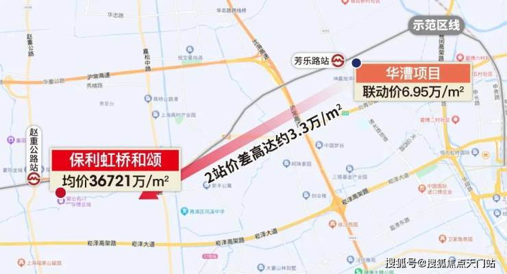 一方面,沿着示范区线2站外的华漕已 6.95万/㎡,1站外的华新 4.75万/㎡,这样的差价在全市都极为少有。