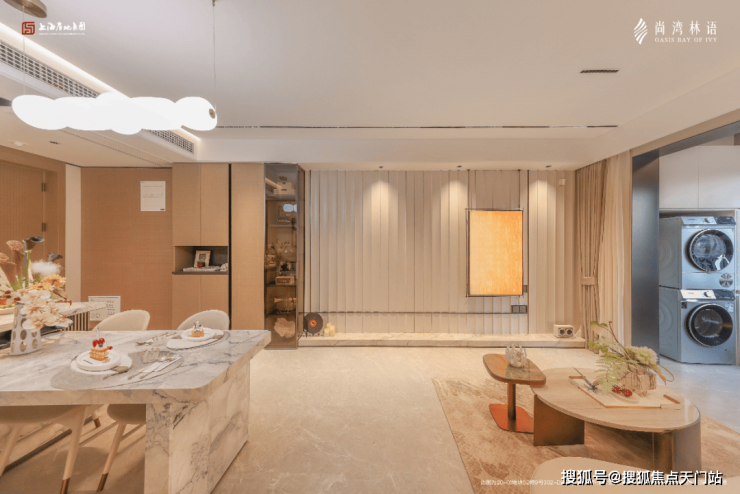 一楼电梯厅墙面铺设大面积岩板,吊顶也颇具设计感。
