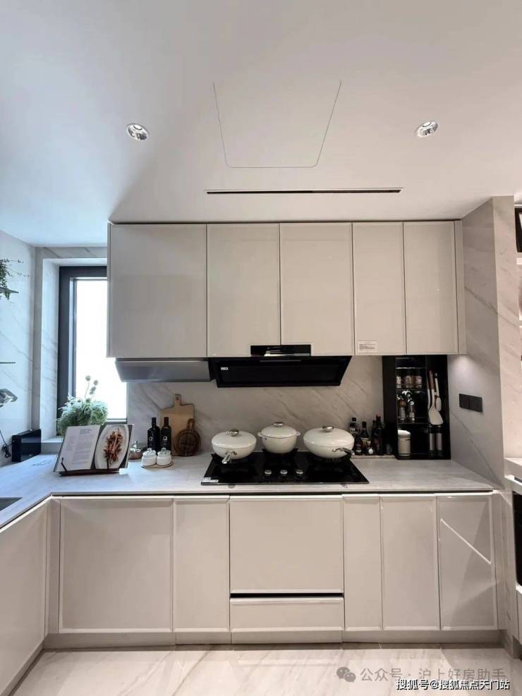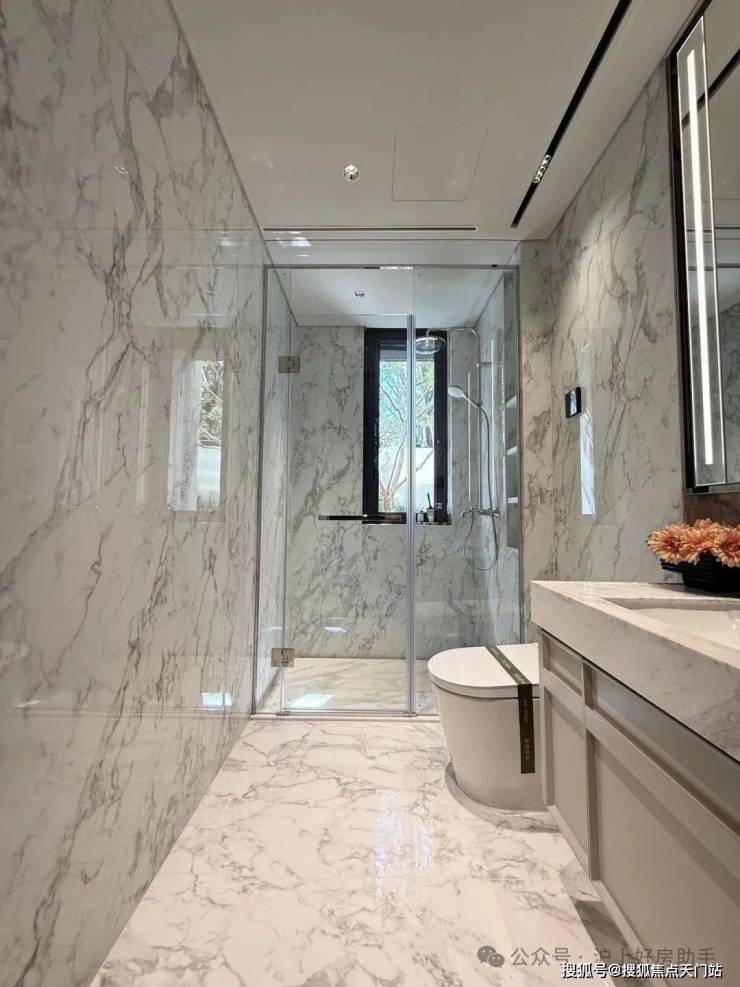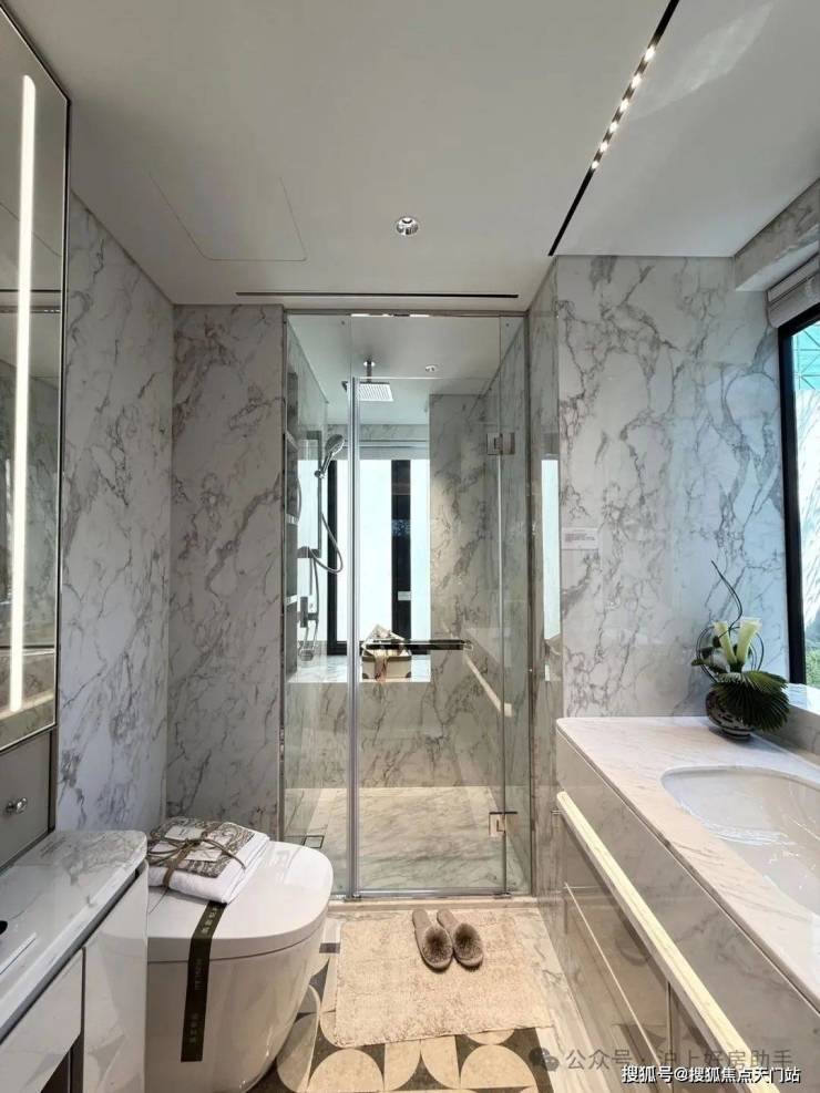 收纳细节上,二期户型中完美继承了一期的收纳系统,玄关收纳,整面内嵌柜体一直延伸到餐边柜;厨房全屋定制的柜体;卫浴的镜面柜和美妆冰箱等等,主卧卫生间的进一步升级:洗手台与化妆台相对,拥有三面镜柜,视觉空间进一步扩展和延伸。