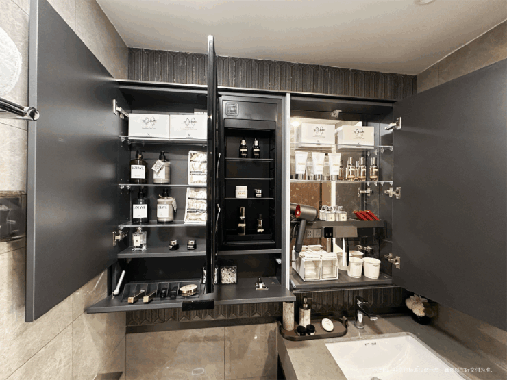 衣柜巧用门后垂直空间,设置大量挂衣区与双面柜体,实现空间翻倍;主卫镜柜分层设计搭配分隔盒收纳护肤品,地柜采用抽屉式设计并内置防水收纳盒,分类存放清洁用品,细节满满。