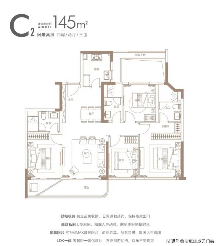独立玄关、U型厨房、主卧大套间、三开间朝南大面宽 等均为标配,堪称140㎡段的“完美四房”。
