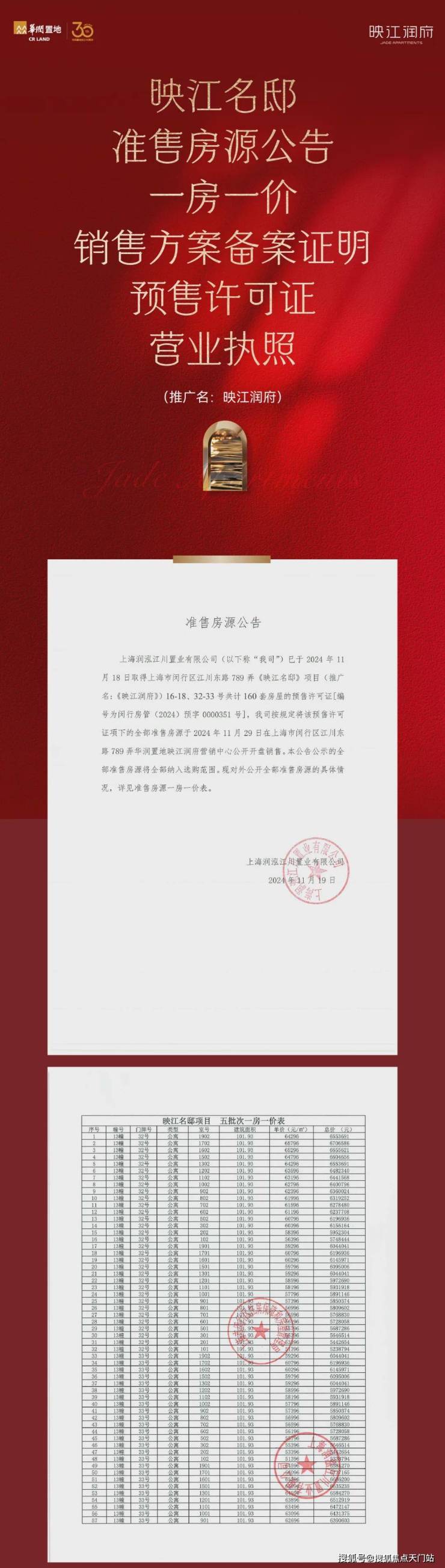 本资料为要约邀请,不作为要约或承诺,项目具体信息以政府最终审批文件为准;项目周围环境、交通及其他公共设施的效果示意以实际落成或政府部门标准文件为准。有关学区划分根据政府部门当年的划分为准,不作为开发商的任何承诺。相关宣传内容不排除因政府规划、规定及分期规划、未能控制等原因发生变化,在不违反法律法规、合同约定前提下,本公司有权对该宣传资料细节进行调整或更新。预售证号:闵行房管(2024)预字0000120号、闵行房管(2024)预字0000164号、闵行房管(2024)预字0000232号、闵行房管(2024)预字0000269号、闵行房管(2024)预字0000351号。制作日期: 2024年11月19日。开发商:上海润泓江川置业有限公司;备案名: 映江名邸 ;营销推广名:映江润府
