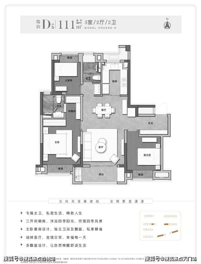 想要加大点空间,还可以选择建面约111㎡的3房,主卧可放置1.80米的大床及2个床头柜,次卧作为客房和儿童房可轻松放置1.5米的床铺及2个床头柜。