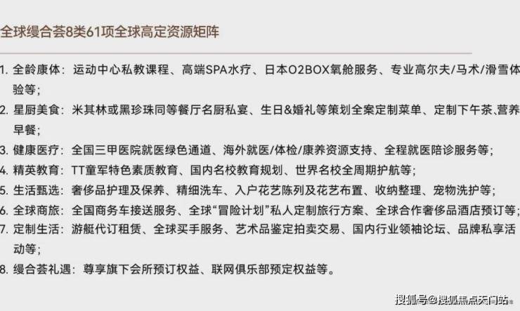 并 链接8类61项全球尖端资源,从运动、教育、旅行、医疗等多维度,可谓把全球一线资源与全新生活方式注入古北99,对标国际高端生活标准。