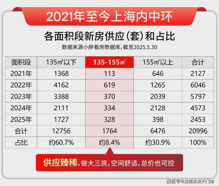 据小胖看房数据库显示,自2021年至今,内中环供应中,135㎡以下户型占比高达约60%,且多为90-110㎡小户型, 这类“70/90 政策”下的产物,未来几年将大量涌入二手房市场,竞争白热化。
