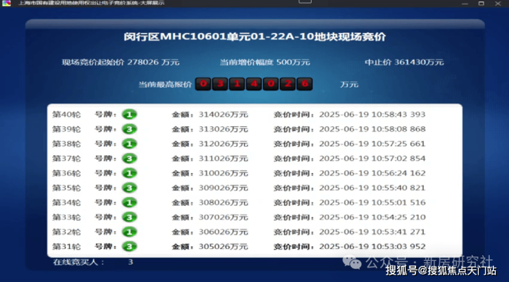 6月19日,闵行1幅地块出让,地块名称为颛桥镇MHC10601单元01-22A-10地块,规划用地性质为住宅用地,出让面积4.05公顷,容积率为2。经过40轮竞拍,最终由上海保利城市发展有限公司竞得,总成交价314026万元,溢价率12.95%。