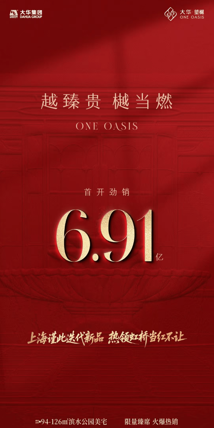 1月25日,全上海聚焦大虹桥,由华集团匠心打造的徐泾封面作品——大华·望樾于万众瞩目下盛大首开。项目凭借自身优质的产品力与创新力,首批次建筑面积约94-126㎡滨水公园美宅,当日成交金额突破6.91亿元大关,强势领跑区域市场!