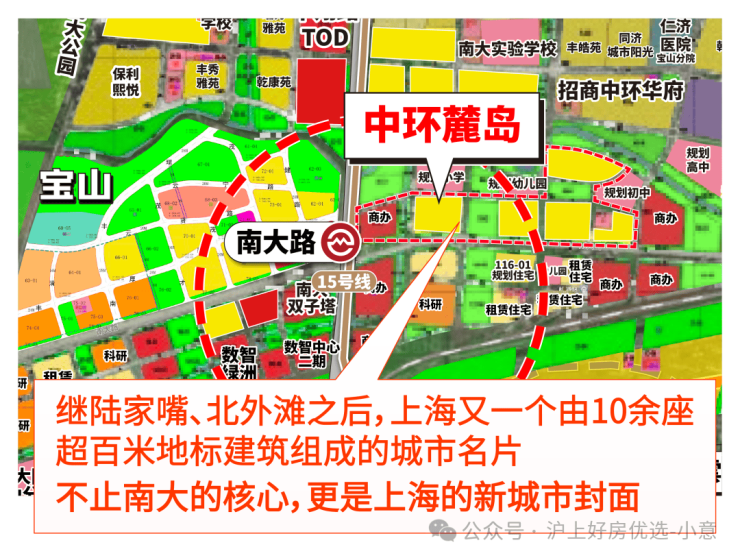 以南大路为核心,周边约100米范围内多座超100米,最高约250米的地标建筑。这里不仅是南大的产城融合中心,更是继陆家嘴、北外滩、前滩以及徐汇滨江的下一个地标建筑群。