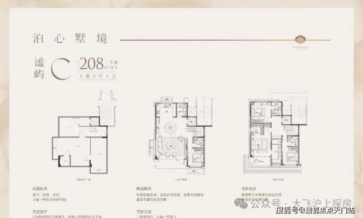 户型特点:下叠边套,南向面宽约9米,客餐厅同宽约5.8米,空间开阔。一楼设南向卧室,采光好且视野佳。二楼为三套房+主卧总统套房设计,主卫南向,可容纳浴缸和双台盆。地下室方正,附赠采光井,利用率高。