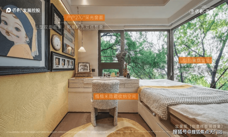 次卧实现270°L型飘窗,双向窗户采光,可以轻松拓展出书桌及收纳空间,尺度感非常不错。