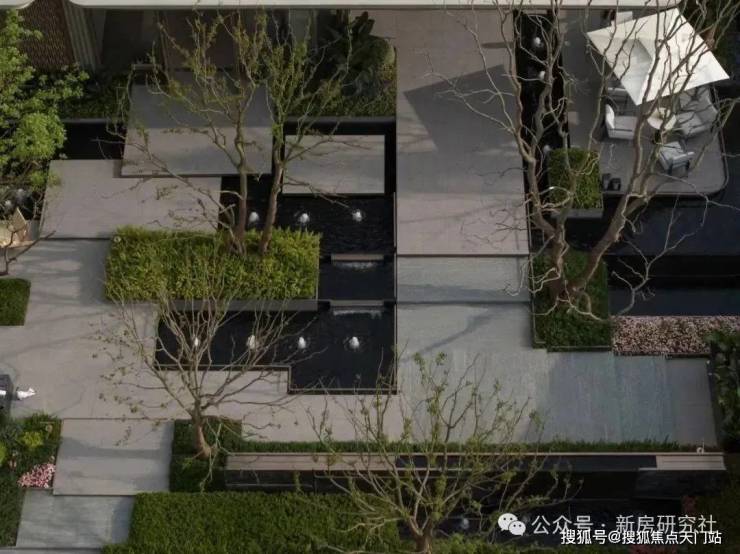 通过建筑门头来到礼仪归家水轴线。层级叠水与叠水景墙结合,再搭配阵列的乔木与草坪灯,形成尊贵归家礼仪感,强调轻奢度假感,始终贯彻现代轻奢度假的设计理念。点缀的涌泉与植物相映成趣,希望每一位业主都能在归家之前恢复平静的心情。通过涌泉、叠瀑、镜面水等多种景观形态,让业主能够感受到人与自然和谐共生。