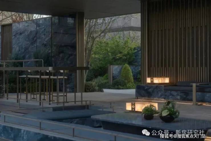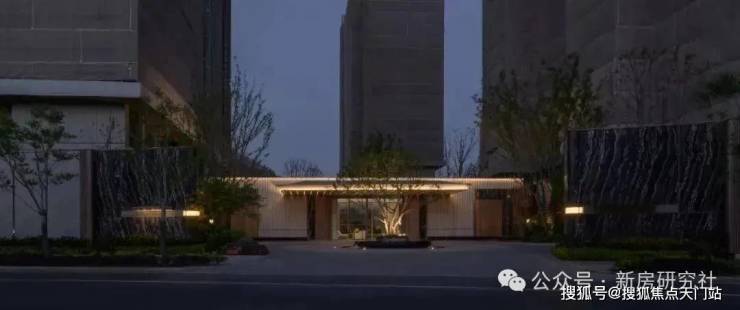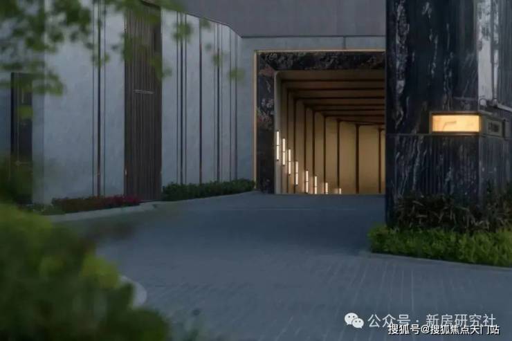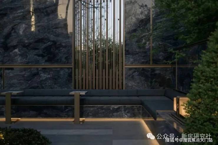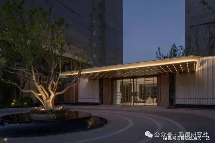 入口两边采用实体景墙与格栅形式,形成围合式院落空间,景墙前端采用奢石与金属点缀,墙面使用照壁灯有序排列,尽显奢侈度假风范。两侧阵列植物绿化,营造迎宾仪式感,凸显品质与调性。 院落内部设计采用了酒店式下落客的设计手法,中心圆形水盘聚八方之财气,寓意财源风水。圆盘水景中间选用特选造型树点缀,营造浓郁的度假氛围。配备豪华酒店式落客区的大堂设计,实现业主尊贵的归家仪式。
