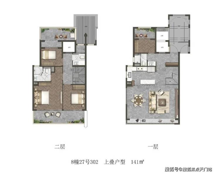 以建面约141㎡ 上叠户型为例:格局与下叠基本相同,约7.2米的横厅,客厅局部挑空。北向的储藏室附带阳台(阳台可打通,改造成北向房间),二层则拥有南北双露台。