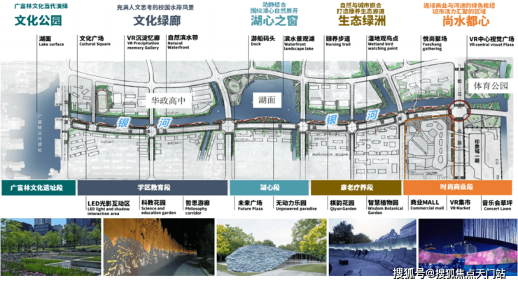 一个复合城区:功能集聚办公、商业、住宅、养老等类型,河道两岸布置教育、医疗、体育等公共设施;