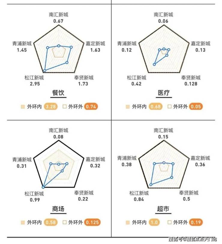 松江新城是上海最早开发的新城,也是最早通地铁的新城,商业医疗等城市配套密集程度在新城中首屈一指,下面这个对比一目了然。