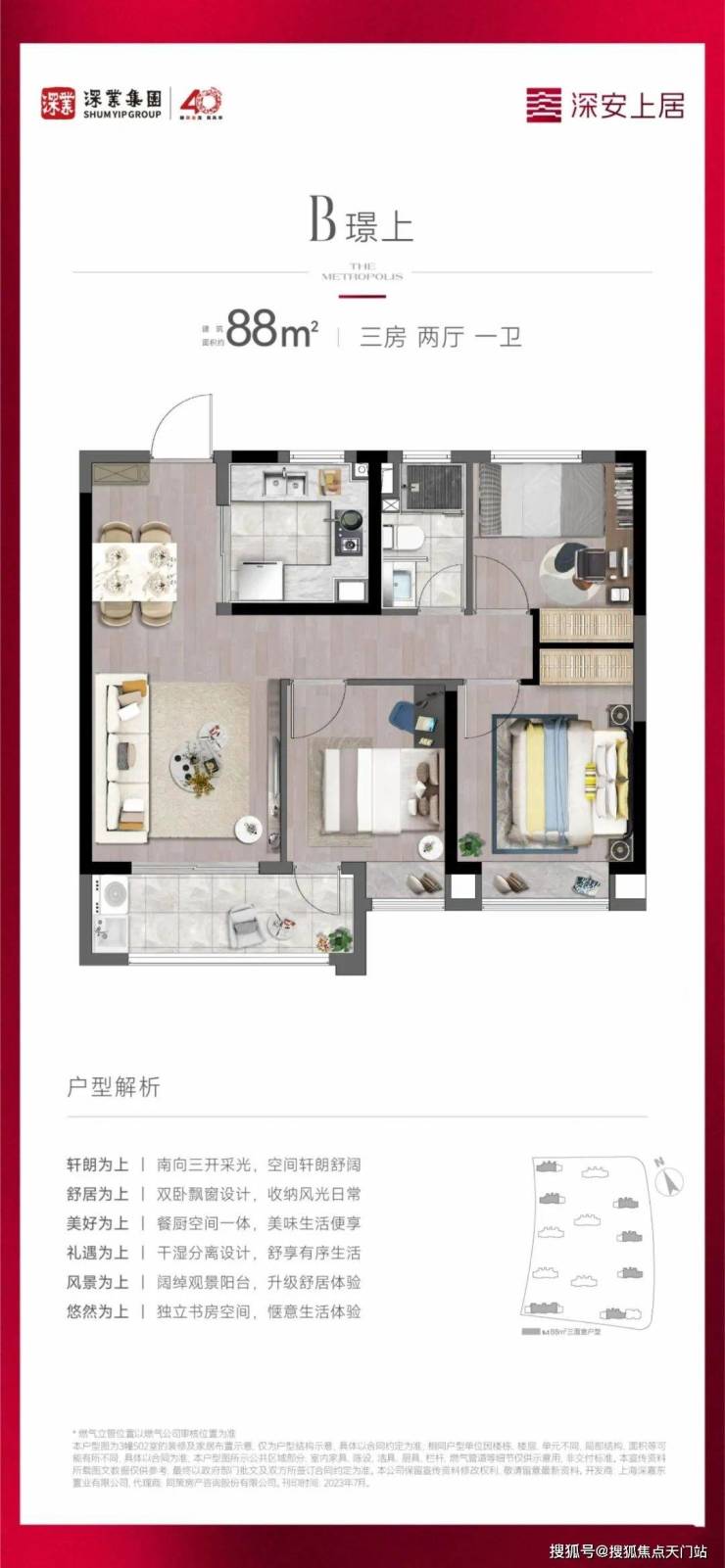建面约88㎡3房2厅1卫户型,做到了三开间朝南+双朝南卧室带飘窗+动静分