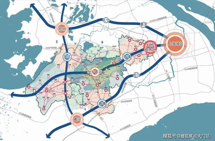 3轨2高铁5高速:17号线、沪苏嘉示范区线、苏淀沪城际线,虹桥高铁站和练塘高铁站(沪苏湖高铁),沪渝、沪常、申嘉湖、沪昆、上海绕城高速,接驳虹桥和上海主城,通达长三角。