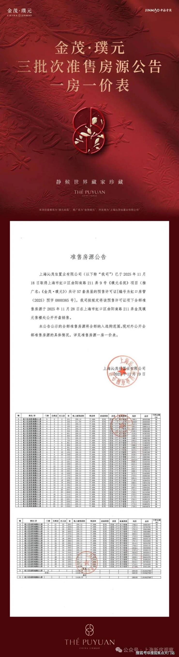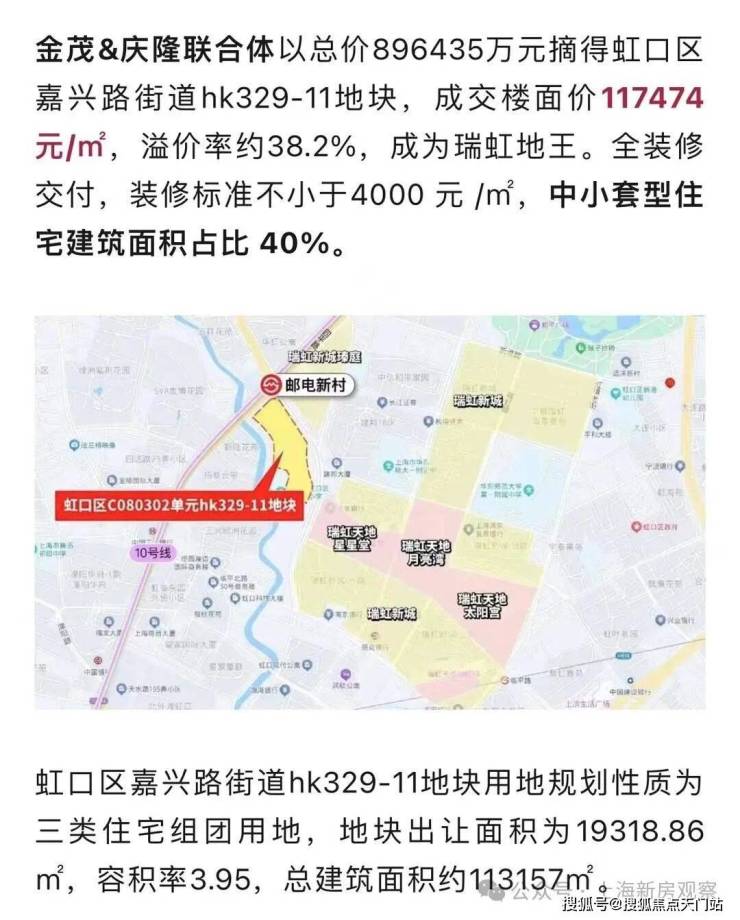 最新消息!上海2025年首个地王“瑞虹地王”金茂+庆隆瑞虹项目正式定名「金茂·璞元」 首开售罄!三期建面约200㎡4房;均价16.81万/m²,总价2800-3670万!一梯一户,得房率82-85%,高隐私、空间感强;售楼处线上火热预约中!
