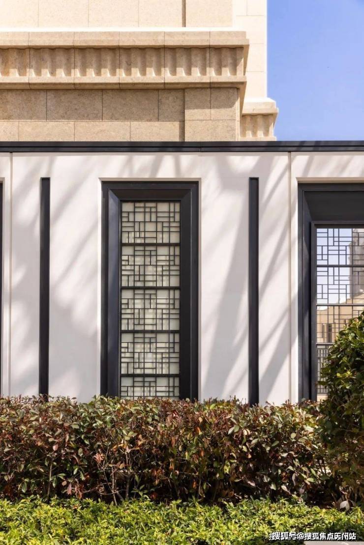 再来看公区,庭院的格栅,同样做了造型化处理,镂空形状不一,随着日光位置的变化,阳光洒落,造型十分灵动。