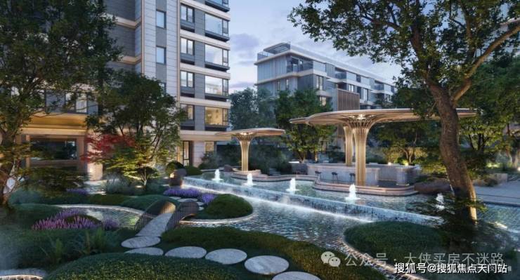 酒店式迎宾水景,以轻柔白噪音的形式,让归家心情瞬间切换;巨型艺术装置,铺垫诗意生活的氛围。