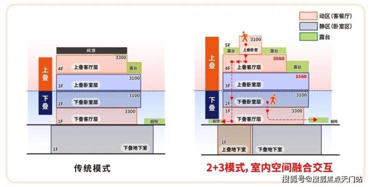 传统下叠的核心竞争力是庭院和地下室,但大多做得敷衍:庭院是楼缝里的 “巴掌地”,地下室阴暗潮湿只能堆杂物。
