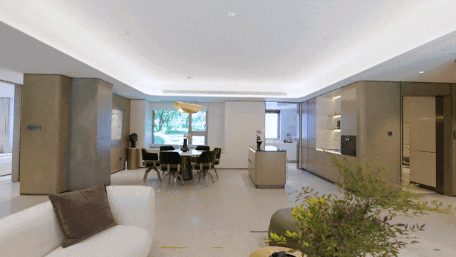 来看看公共空间,阳台、客厅、餐厅、厨房四大空间贯穿为一体,让社交空间、会客空间、烹调空间连成一体,无柱设计,可以任由发挥。