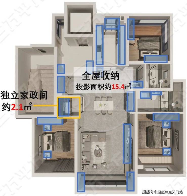 本户型 全屋收纳空间顶面投影面积达到了约15.4㎡ ,覆盖玄关柜、客厅储物柜、卧室衣柜等多元场景。