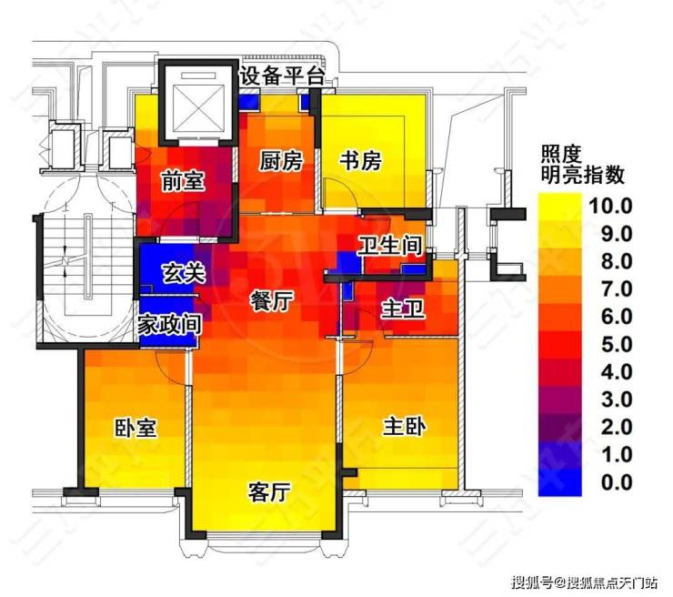 下图为采光测算,照度明亮指数反映了该区域采光条件的好坏。 图中黄色代表采光最好的的高照度区 ,临近窗户处,在白天拥有明亮采光。蓝色区照度最差,通常位于走道、玄关等空间,因远离窗户或受墙体遮挡,自然光线难以充分进入,照度低。若用于阅读、精细作业等场景,可能因光线不足导致视觉压力,需依赖人工照明补充。