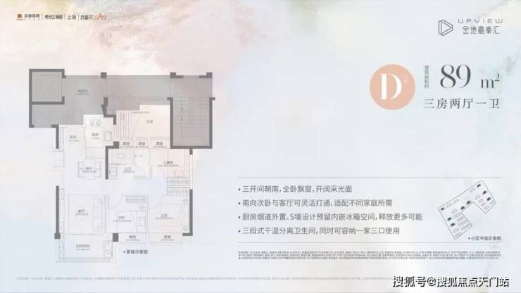 首先,是建面约89㎡三房两厅一卫(D户型),不仅功能完备,而且很好地把控了总价,约350万起即可上车高配品质三房,堪比市场上110平左右的空间感!