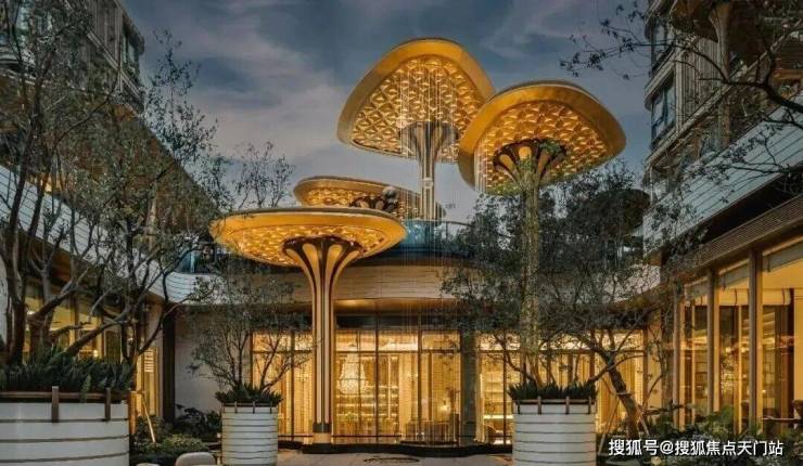 以雅艺柔美的对称主义构筑社区入口大门,从森林中获取灵感,宏观提取叶脉形态,呈现犹如自然中的脉络与流动;同时深入微观的细胞视角,复刻植物的几何纹理与结构逻辑,以自然的秩序与美学塑造 花瓣状的母题造型”