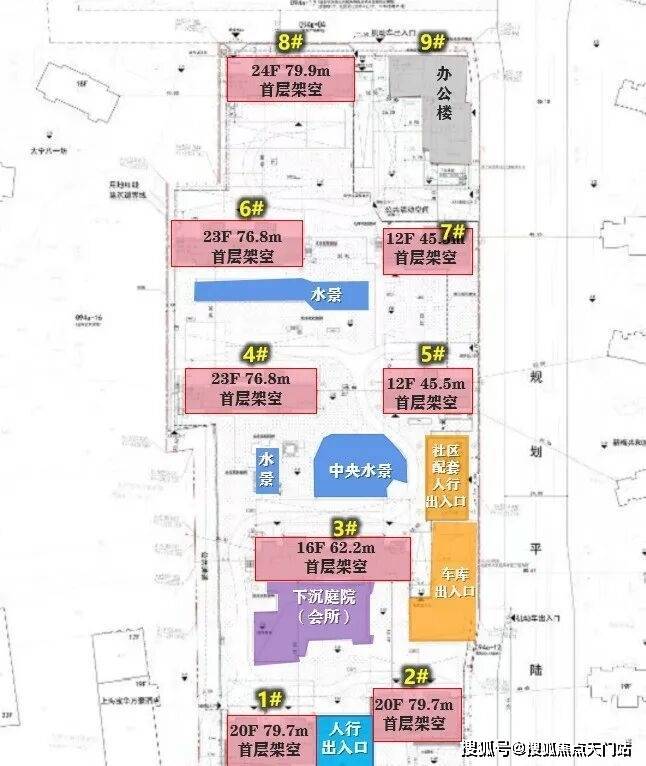该方案亮点颇多,总计八幢高层和小高层设计,最南端的1#和2#楼均设置有私家泳池,而且还在19F采用了住宅楼当中较为少见的悬挑工艺,延伸出了一定的使用空间,个人预估这两幢会是配置大平层豪宅产品。