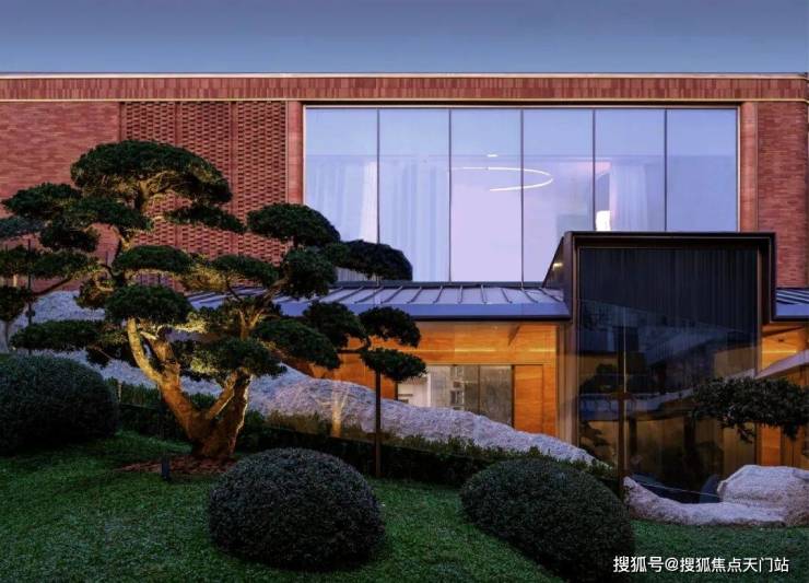 第一重-堂前会客 ,这里首先营造了满满的社区入户的仪式感,通过红色陶砖与红洞石以及大面落地玻璃营造出了层次丰富的艺术立面。营造业主在家庭空间以外进行接待交往的处所。