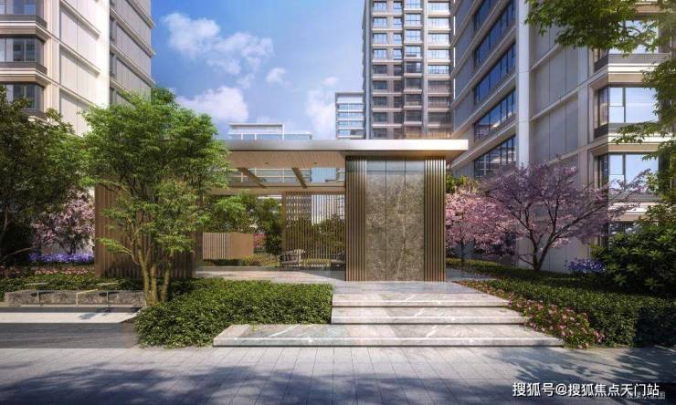 尺度大气的现代风格门头,入口展现艺术水苑、叠水瀑布以及层级绿化,彰显归家仪式感。