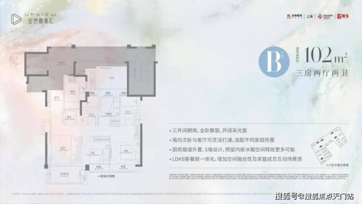 A户型是建面约102㎡3房2厅2卫,该户型 三开间朝南,采光效果上佳。 大方厅设计,空间开阔自由度更高。南向次卧和客厅可灵活打通,适配不同家庭所需; 大进深阳台+全景落地窗,让室内的通透性和视野可圈可点。