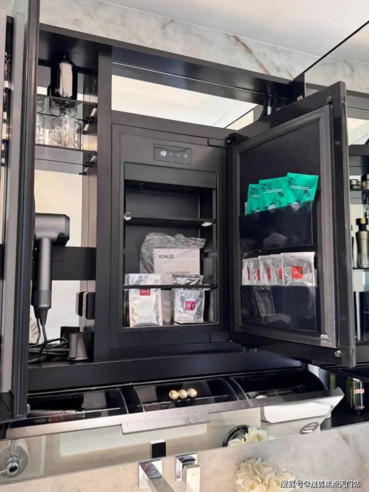 值得一提的是,项目卫生间采用了 科勒一体式镜柜,区别于市面上常见的分装拼接柜。这种一体化设计将镜柜、照明、美妆收纳和美妆冰箱功能 高度集成,带来更高的美观度与使用便利性!
