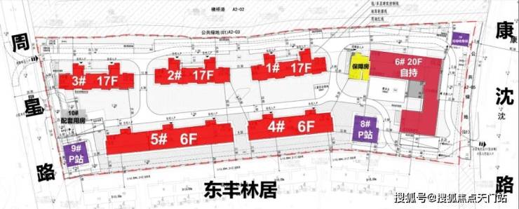 根据设计方案显示,地块拟建 3栋17层高层(1#、2#、3#), 2栋6层多层(4#、5#),以及一栋保障房、 6#为20层的高层,开发商自持。 可售住宅约262套