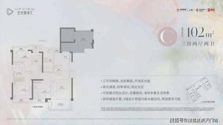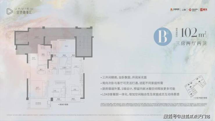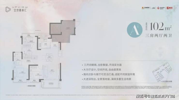 A户型是建面约102㎡3房2厅2卫,该户型三开间朝南,采光效果上佳。大方厅设计,空间开阔自由度更高。南向次卧和客厅可灵活打通,适配不同家庭所需;大进深阳台+全景落地窗,让室内的通透性和视野可圈可点。