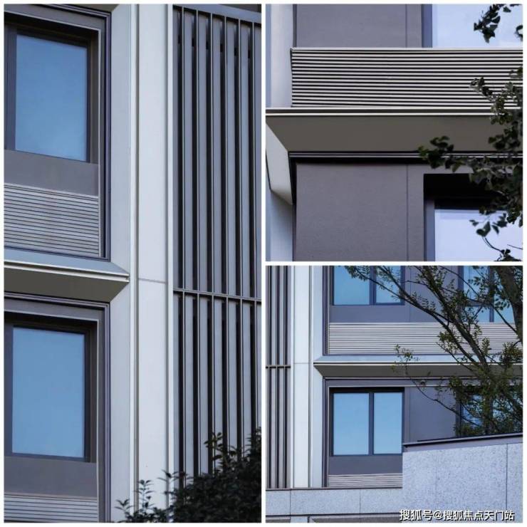整体外立面以浅色香槟铝板线条、深色香槟铝板窗套搭配暖灰色真石漆,配色更具活力。