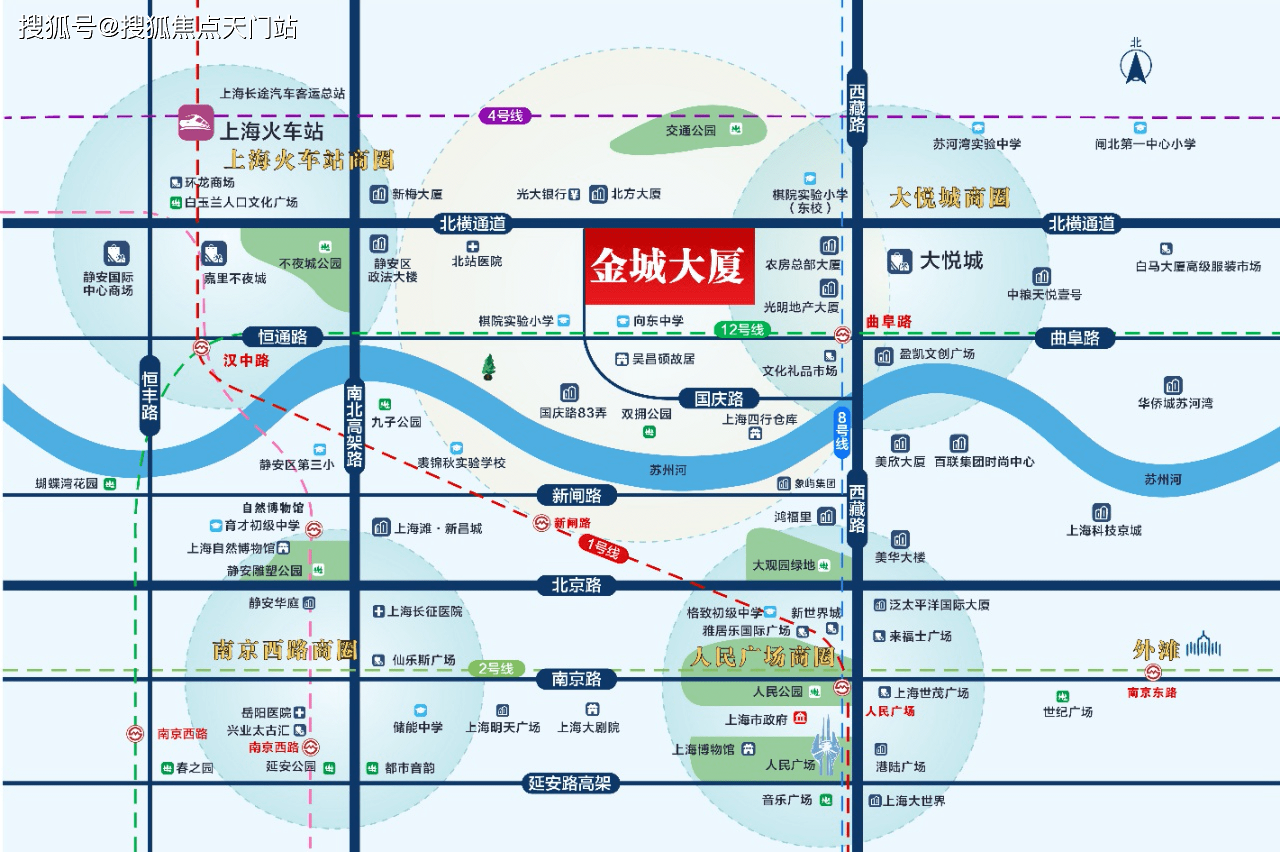 金城大厦位于静安区海宁路1399号,周边商圈环绕与南京东路商圈衔接,步行至南京路步行街1.5km,人民广场1.4km(数据来源高德地图)。静安大悦城购物中心距本项目约600米。项目毗邻苏州河,邻近西藏北路,天目中路 北横通道等多条交通主干道 地理位置优越出行便利。