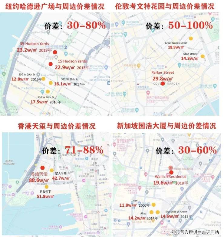 我们来看几个享誉全球的成功案例,纽约哈德逊广场,伦敦考文特花园,新加坡国浩大厦,香港天玺,这些顶级公寓都有一些共性点: