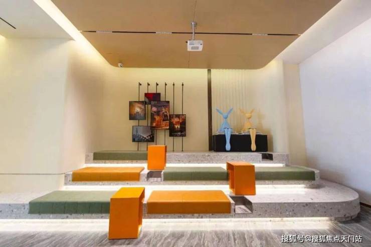 趣遇见·拾光艺境:艺术展览和交流空间,为邻里之间的和谐创造宾至如归的艺术空间,室内外空间的交融,景观地面延续到室内,地面专属楼盘logo专门定制,弧形墙面细节包围,空间静谧。