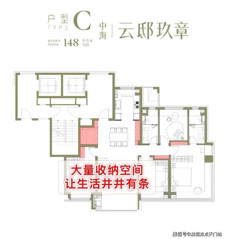 阔绰的南向面宽向来是中海户型的卖点,没想到在建面约148㎡户型上直接做到了四开间朝南,奢侈的南向开间让业主起居之间沐浴充足阳光!