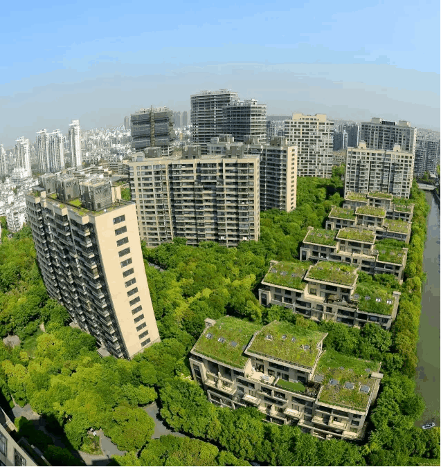 整个社区都是绿色森林,树海环抱, 连底层都挑空6~9米,种植绿色,让每户人家都能“开窗见树”,让房子生长在森林之上。