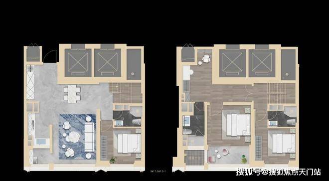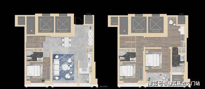 户内楼面高度不一致,错开之处有楼梯联系。但没有完全分为两层。(适合大面积住宅,小户型会显得局促)